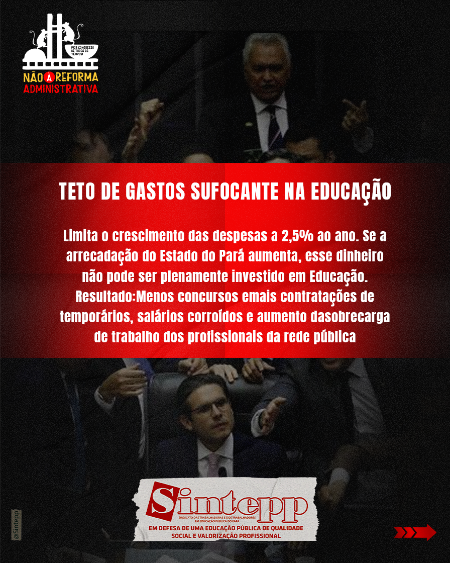 Limita o crescimento das despesas a 2,5% ao ano. Se a arrecadação do Estado do Pará aumenta, esse dinheiro não pode ser plenamente investido em Educação. Resultado: Menos concursos e mais contratações de temporários, salários corroídos e aumento da sobrecarga de trabalho dos profissionais da rede pública.