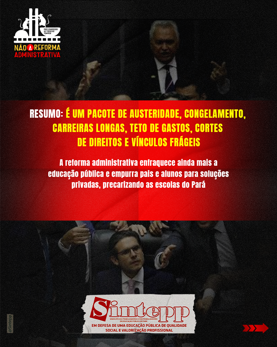 A chamada “Reforma Administrativa” (PEC 32) ataca direitos e o serviço público. Entenda os 5 pontos que atingem diretamente a Educação Pública do Pará: