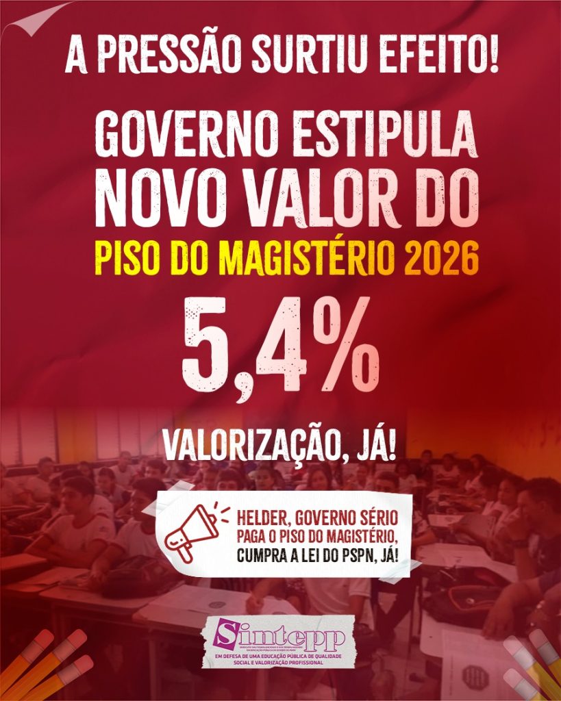 O MEC ajustou nesta quarta-feira (21) o novo piso salarial nacional profissional do Magistério para o ano de 2026, com acréscimo de R$ 262,86. A medida vem após forte pressão das entidades sindicais, filiadas à CNTE, que não aceitaram o percentual anterior de 0,37%, mas ainda está muito distante do que almejamos